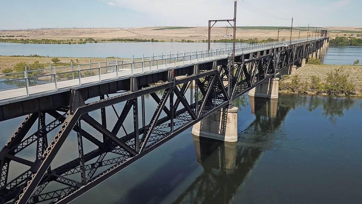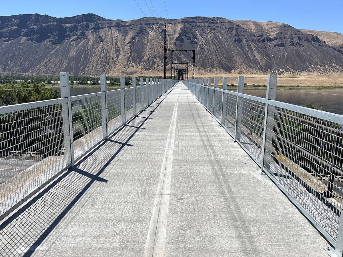 Exeltech developed designs, permits, and construction documents for the rehabilitation and adaptive reuse of the historic, 3,000-foot-long historic steel truss railroad bridge as a non-motorized trail crossing the Columbia River. The Beverly Bridge is the pivotal missing piece connecting the eastern and western halves of the 285-mile-long cross-state Palouse-to-Cascades Trail, part of the Great American Rail-Trail. The project included replacing the railroad ties with pre-cast concrete deck panels and custom-designed steel railing suitable for non-motorized traffic including pedestrians, bicycles, and equestrians. Deck and railing designs were developed to be compatible with yet distinct from the historic characteristics of the bridge. Fencing along the bridge meets WSDOT requirements for protective screening where the bridge crosses SR 243 along the Columbia River. The selected railing is 64 inches high to protect equestrian traffic on the bridge while preserving the scenic views.