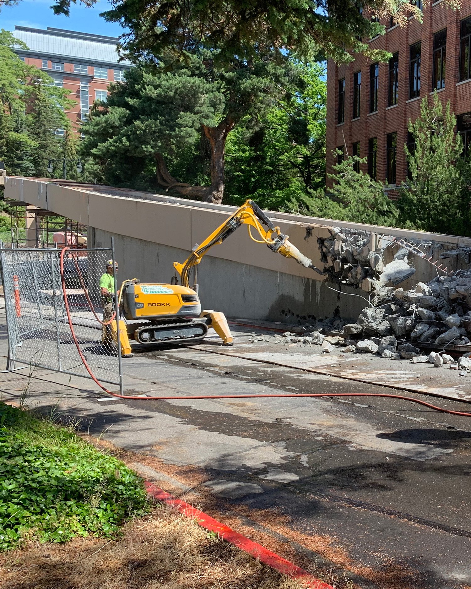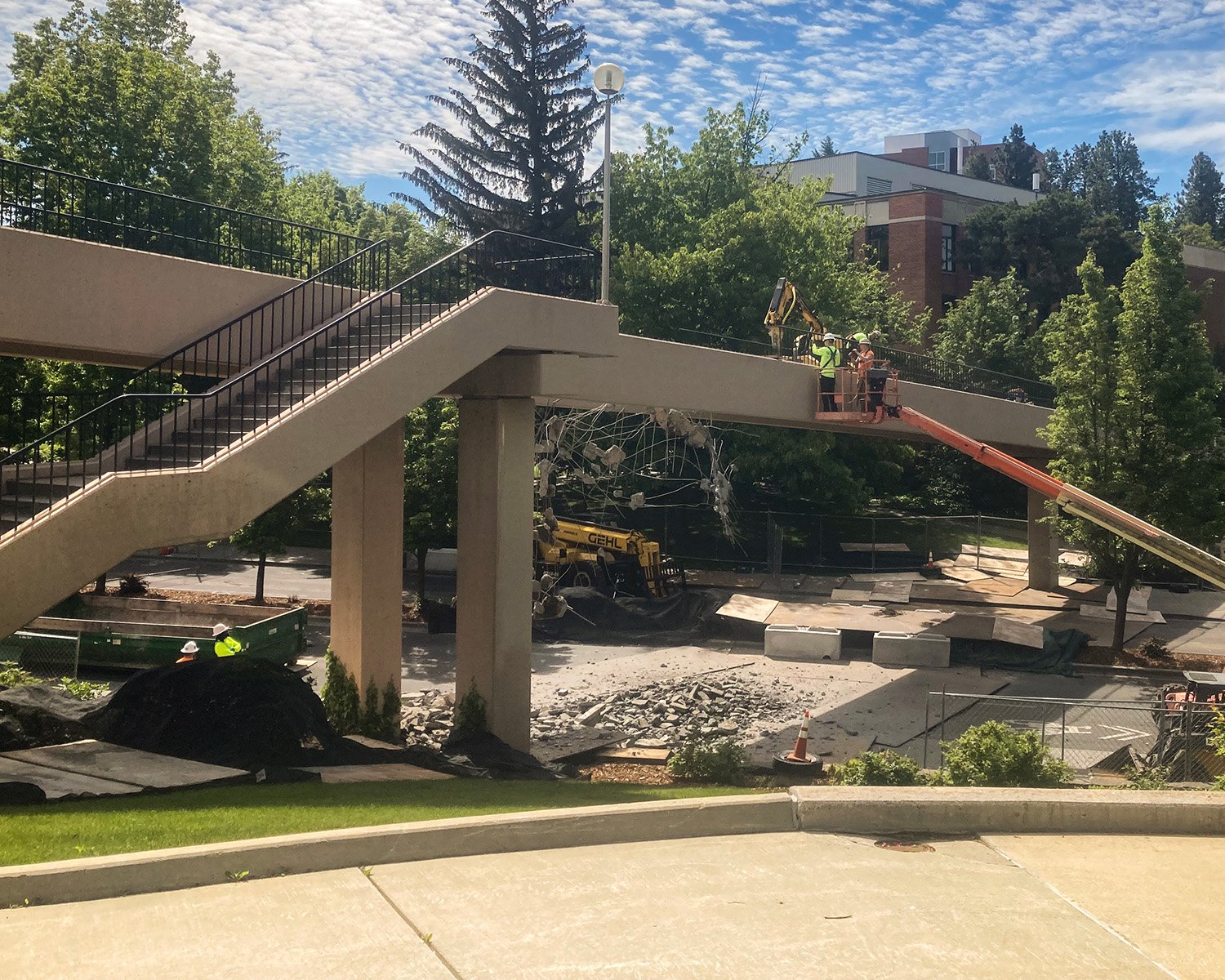 This progressive design-build project removed an existing concrete pedestrian bridge crossing Northeast Stadium Way at Washington State University’s main campus. As the design manager, Exeltech provided civil and structural engineering and landscape architecture services. These services included planning and review of demolition plans; developing Maintenance of Traffic plans for pedestrian and vehicular movement during the demolition of the bridge; retaining walls, roadway approaches, site grading, paving, sidewalk; and landscaping/irrigation. Exeltech coordinated the removal and relocation of existing electrical services, replacement of sidewalk, and restoration of landscape.