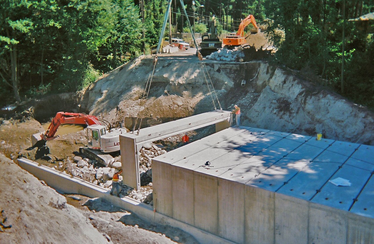 Exeltech completed all design and permitting of a three-sided box culvert incorporating a stream bed simulation design to restore fish passage to several acres of spawning habitat in the Leach Creek watershed upstream of Bridgeport Way, a four-lane roadway. The previous five-foot-diameter culvert did not permit fish passage due to its size, length, and slope. The project required a re-profiling of the existing stream for approximately one-quarter mile to build ponds and riffles for fish passage. Several stream alignment and structural options were evaluated to achieve an optimal solution acceptable to all stakeholders. The final stream restoration design included grade control structures to limit the upstream and downstream channel effects and incorporated placement of boulders, log structures, and riparian restoration to create a complete restoration project.