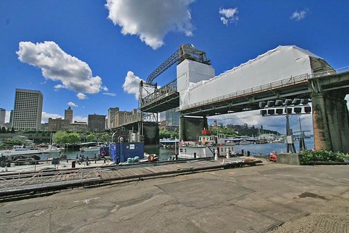 The project was designed to meet the highest standards for stormwater runoff control and treatment due to its location on the highly industrialized Thea Foss Waterway and the potential for encountering contaminated soils or groundwater. Exeltech designed an aboveground wet vault and storm filter system to capture runoff from the City Approach and portions of the Center Truss Span. A bioswale was designed to capture, treat, and infiltrate runoff from the Port Approach. Innovative design work allowed capturing runoff from the movable lift span using a system of suspended troughs and catchment basins.