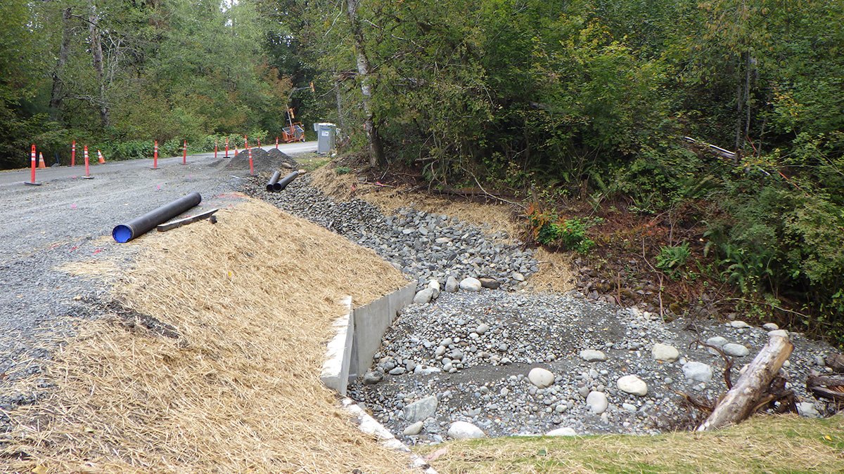 Exeltech provided project management, alternatives analysis, conceptual design, civil and structural engineering, landscape architecture, hydraulics/hydrology modeling and analysis, drainage engineering, traffic engineering, roadway design, environmental permitting and documentation, site restoration and mitigation design, final PS&E, and construction support services. The project replaced an existing corrugated metal pipe culvert with a new concrete box and headwalls with fish passage enhancements to meet WDFW standards. Environmental services included development of environmental documentation, critical areas impact assessment, and preparation of permit plans.