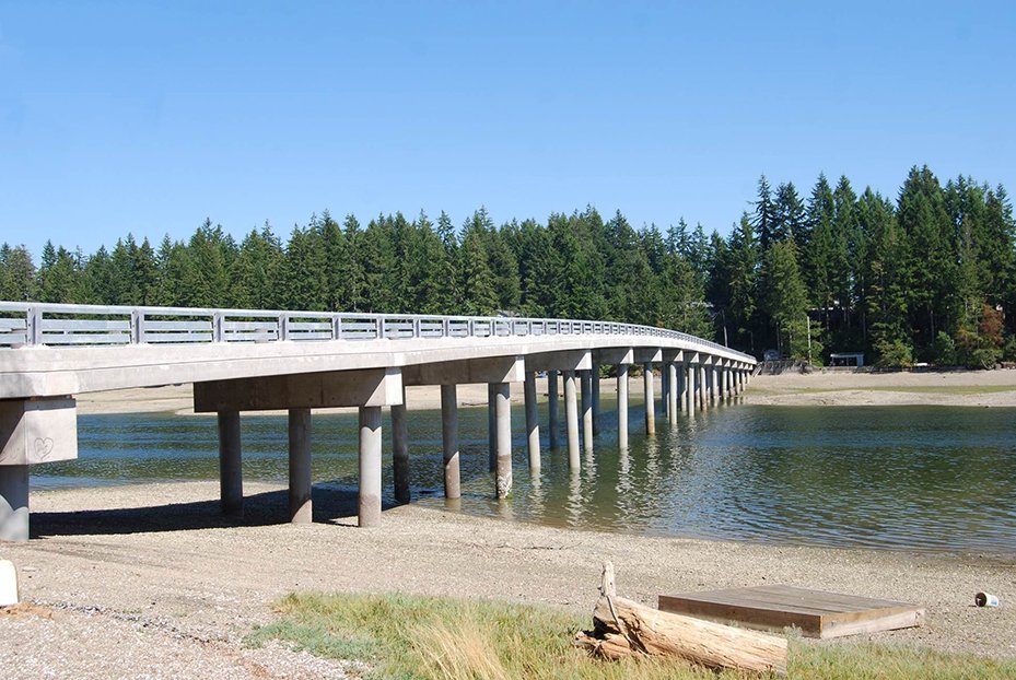 Treasure Island is a private island on Puget Sound, about three miles south of Allyn in Mason County. This project involved determining the extent of deterioration in the existing, privately owned 789-ft timber and concrete structure; providing recommendations and design for short-term temporary repairs; and project management and civil and structural engineering services for preliminary and final design, environmental permitting, and construction management of a new bridge. The new bridge is 22 ft wide, 787 ft long, with 16 spans of precast prestressed concrete slab superstructure supported on steel pipe pile substructure.